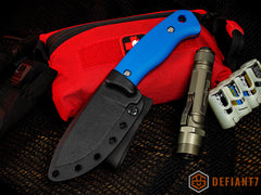 The Bullie is made from Böhler K110 carbon tool steel with a Rockwell hardness rating of 59-60.  K110 offers great edge retention, and you can put a field expedient edge on it while away from home. The knife features a 4" blade with a very durable tumbled finish. The handle features OD Green G10 scales offering great ergonomics and work very well with or without gloves. The Bullie includes an ambidextrous kydex sheath with an IWB loop. The sheath is compatible with Tek-Loks, Discreet Carry Concept clips, as well as UltiClip and others.