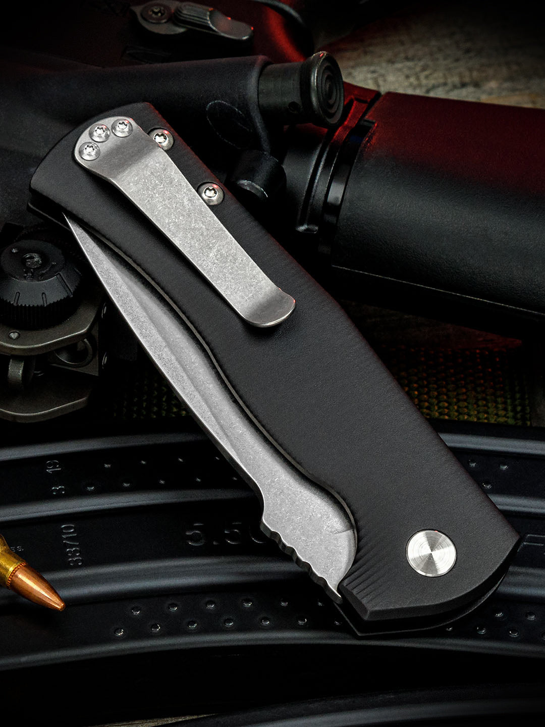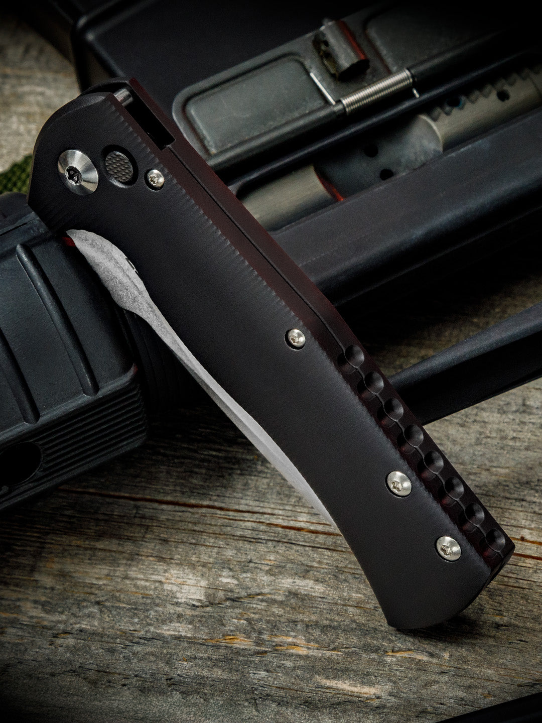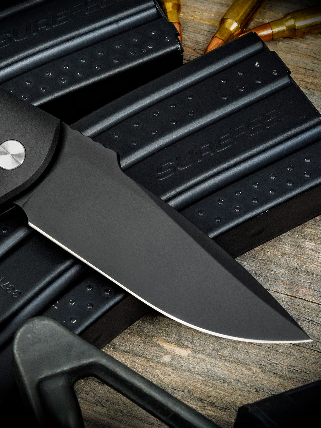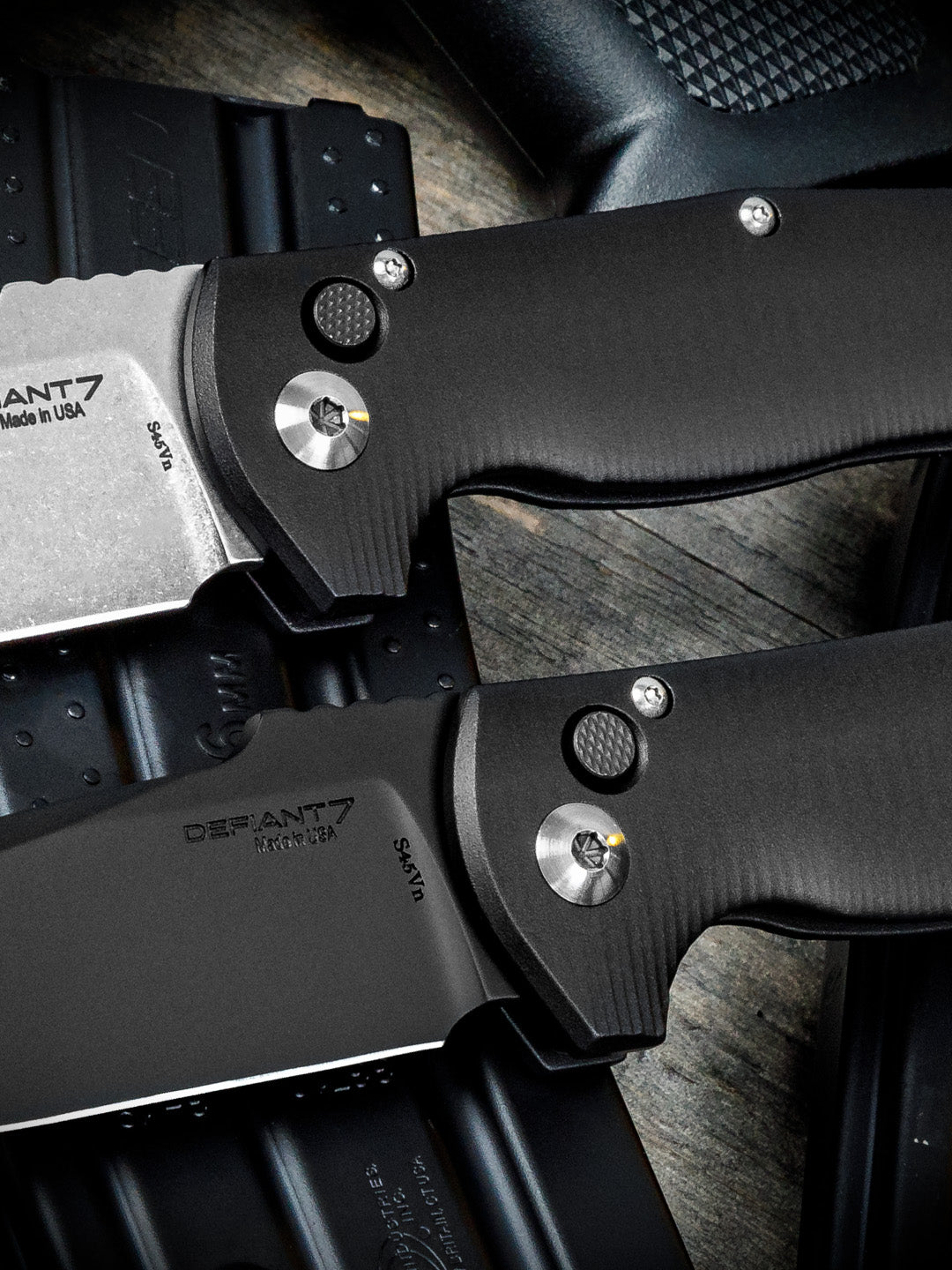 The Eagle is a button-lock auto, that fits perfectly in your EDC rotation. Eagles are constructed with 3D contoured, 6061 aluminum handles in a rich, black hard-coat anodized finish with a light machined texture for a sure grip. Each knife features a titanium pocket clip for tip up carry. The 3.75" blade is made from S45VN stainless steel with a HRC of 59-60. Weighing in at only 4.4 ounces, this is one knife you won't leave at home!