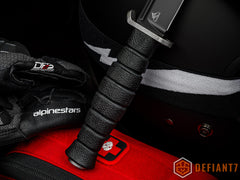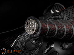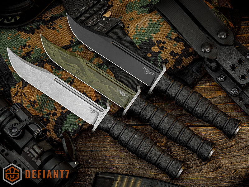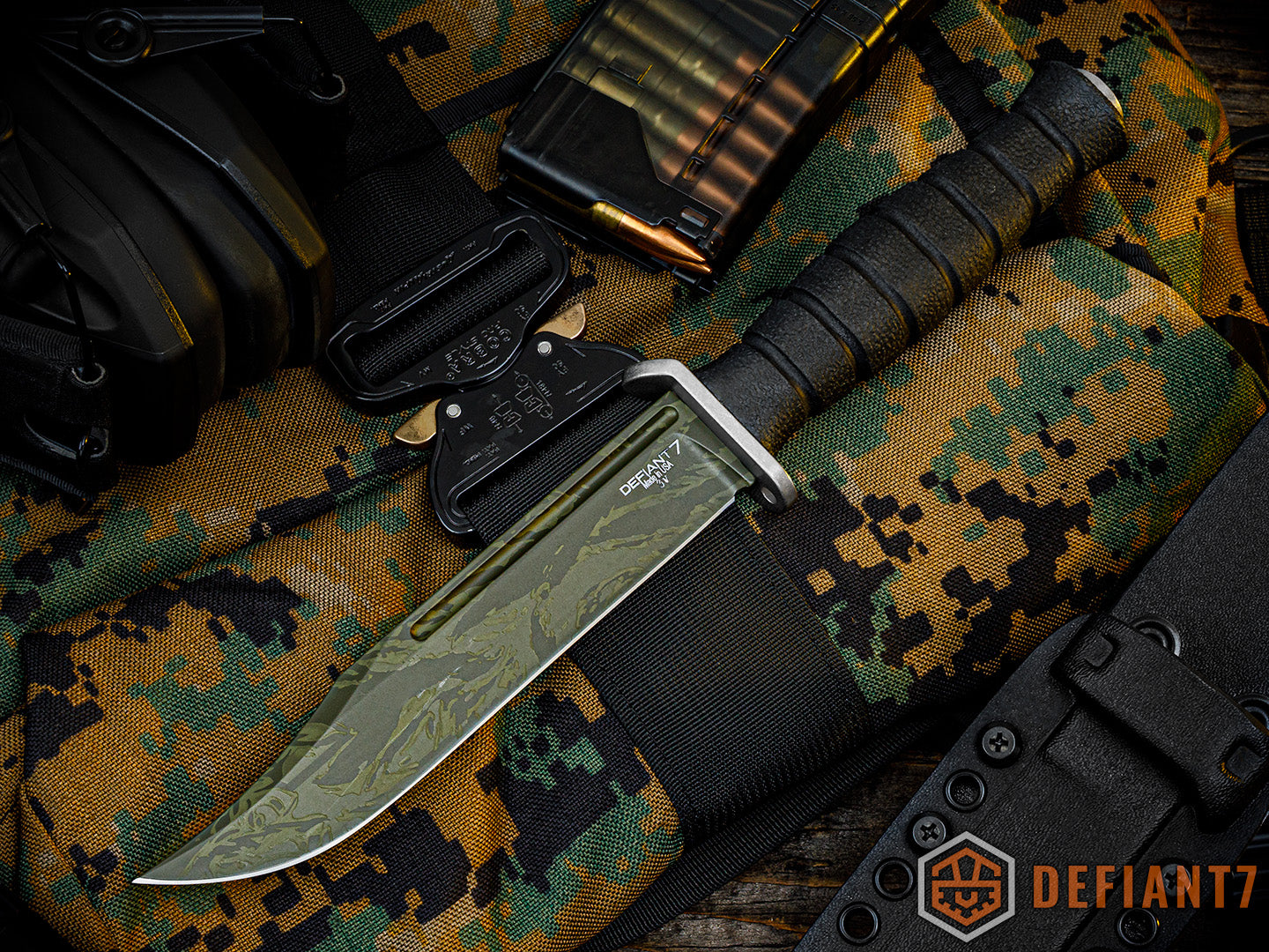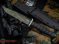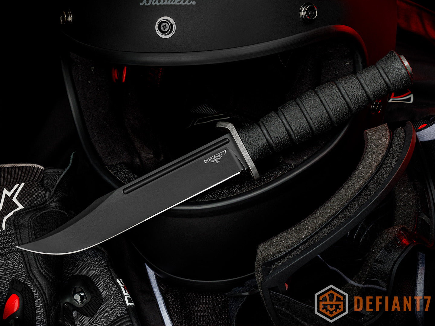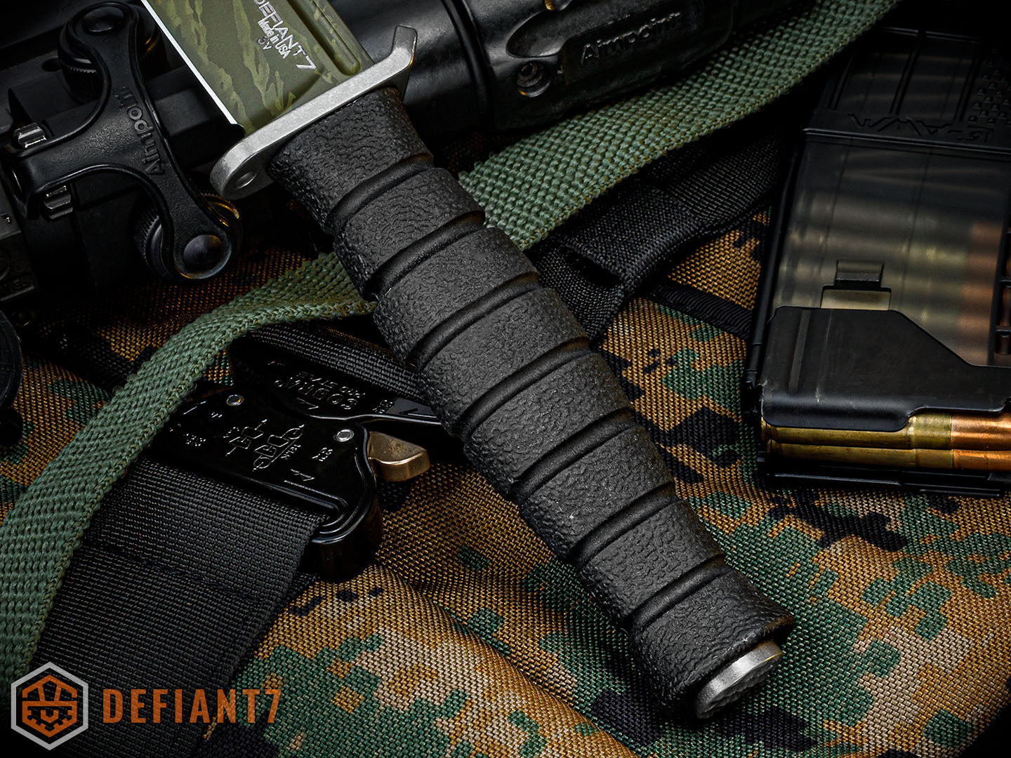 The M320 is 11" overall with a 6.75" blade made from ultra tough, 3/16" thick CPM-3V Carbon Steel (HRC 59-60). The knife has two distinct titanium parts, the guard is machined from a solid 1/2" thick billet of Grade 5 titanium, and the aggressively textured, butt cap is also made from the same material. The full-tang handle features a super durable and grippy injection-molded Polymer handle that offers a sure grip in all conditions. We include a ambidextrous kydex sheath that works great for belt carry and it can be attached to PALS webbing on a wide range of gear.