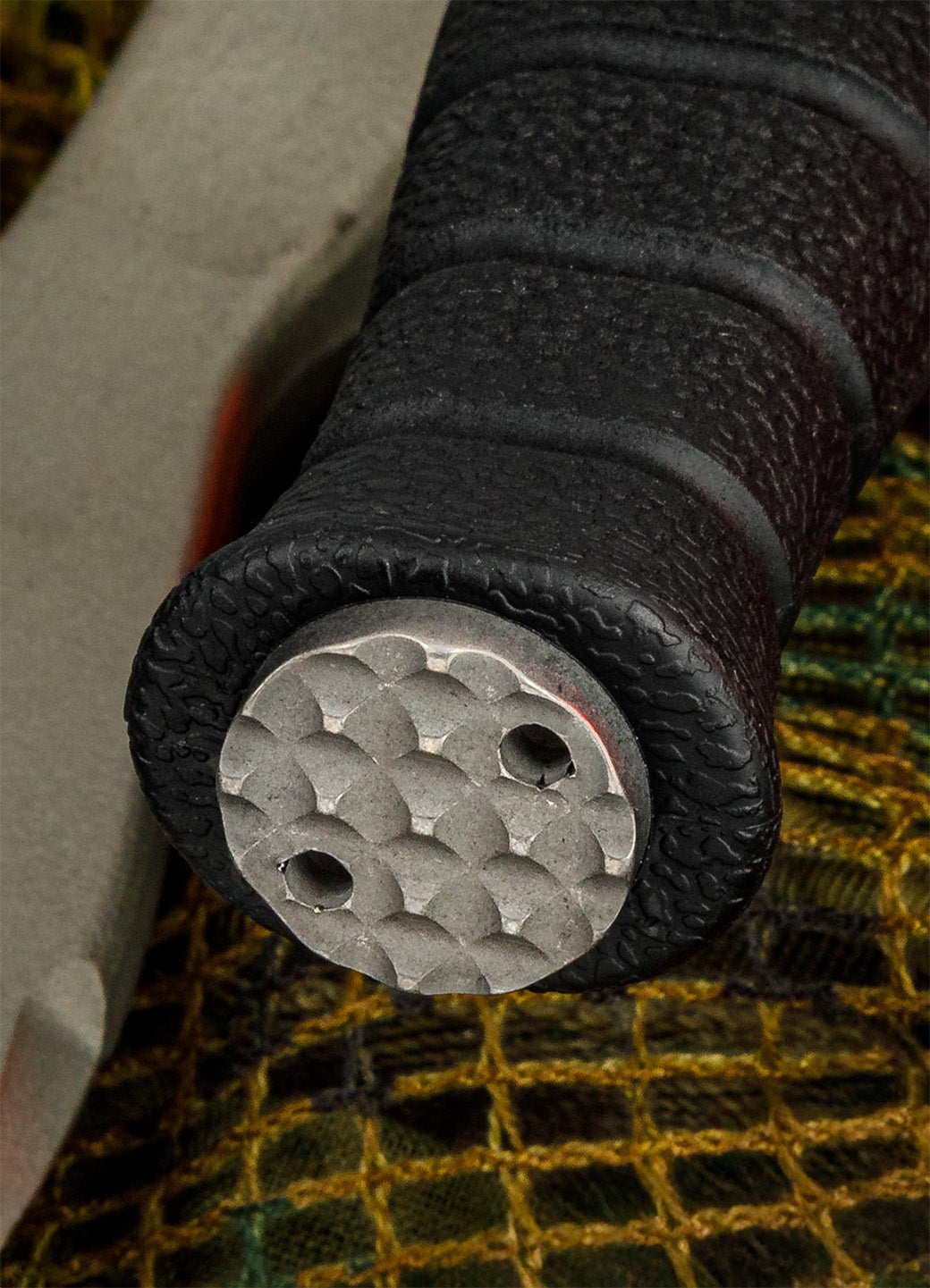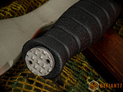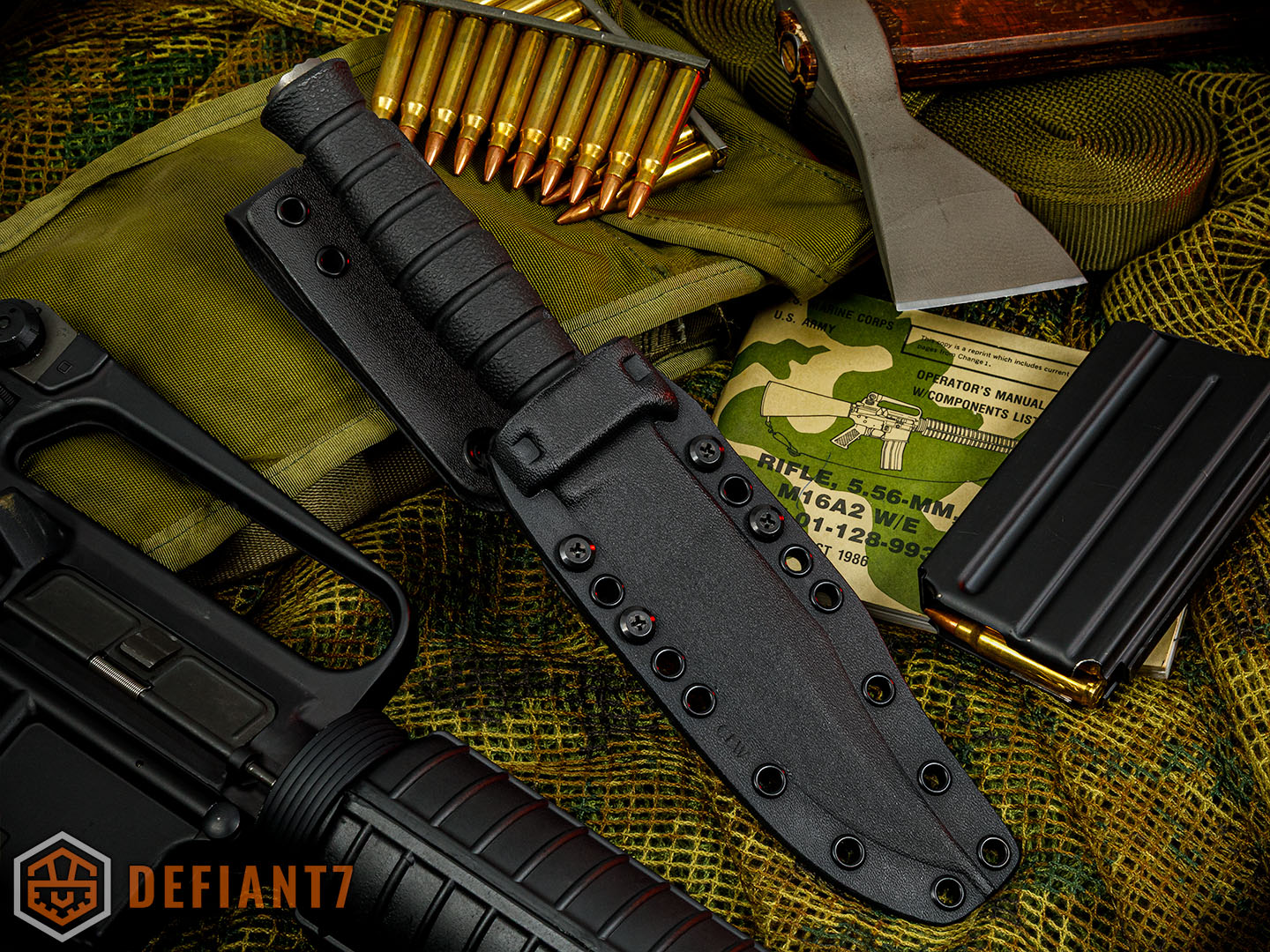 The M320 is 11" overall with a 6" blade made from ultra tough, 3/16" thick CPM-3V Carbon Steel (HRC 59-60). The knife has two distinct titanium parts, the guard is machined from a solid 1/2" thick billet of Grade 5 titanium, and the aggressively textured, butt cap is also made from the same material. The full-tang handle features a super durable and grippy injection-molded Polymer handle that offers a sure grip in all conditions. We include a ambidextrous kydex sheath that works great for belt carry and it can be attached to PALS webbing on a wide range of gear.