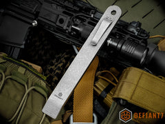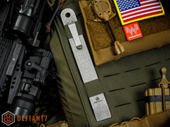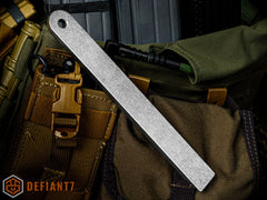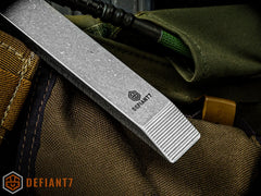 The latest in a series of hard use tools from Defiant7. The Ti-Pry is a simple, lightweight, tool that can be easily carried everywhere. With its 1/4 inch thick Grade 5 titanium stock, it ready to pry, jimmy, scrape and it can serve as a back up defensive tool when needed. Purposefully designed to fit in a single channel of PALS webbing for easy carry and deployment. Save your knife for knife stuff and use the Ti-Pry to beat the snot out of and pry things. Just the ticket for your ready bag, tool box or oh-shit kit.